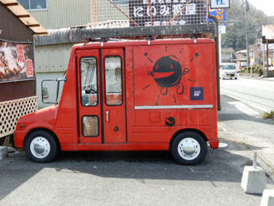 駐車場に何気に置いていたダイハツ ミラバン。丸くて黒い謎のキャラ(黒豆スイーツのお店として使われていたとのことです。)が印象的です。